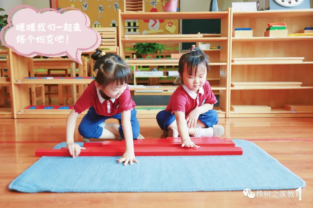 大家好,我是橡树之家教育.翰林园的“刘书棉”小朋友,我今天选择的工作是感官领域“长棒”的工作,这是10根长短不同长棒,我今天要和我的朋友一起,用这些长棒搭建一辆坦克.....